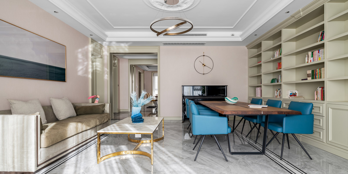 褪去城市繁冗华丽的外壳,回归至与人的内在共鸣,斑驳的光影在客厅空间徜徉,大理石与墙板的搭配,释放出一种优雅、沉静及治愈的氛围感,贯穿于整个别墅装修空间的动线。