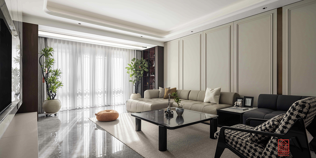 客厅采用磁吸轨道无主灯设计+定制灯带,以舒适合理的线条,引领室内氛围光,拉伸层高,扩充格局,让业主真正感受私人订制设计之美。