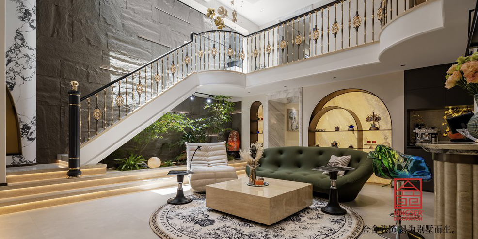 褪去城市繁冗华丽的外壳,回归至与人的内在共鸣,斑驳的光影在客厅空间徜徉,大理石与墙板的搭配,释放出一种优雅、沉静及治愈的氛围感,贯穿于整个别墅装修空间的动线。