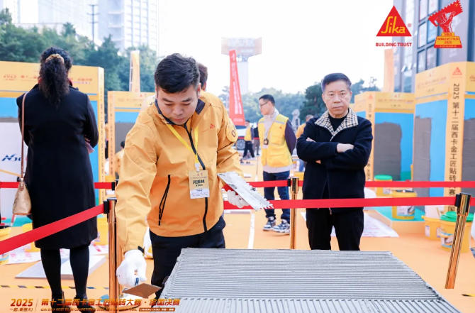 作为家装行业的顶级技能赛事,西卡金工匠大赛以考核严苛著称,本届赛事吸引了全国数十家头部企业的精英选手同台竞技。比赛采用现场实操的考核模式,裁判组从施工操作、胶浆厚度、表面平整度、缝宽均匀、灰浆饱满度等几个维度进行量化评分,任何一项指标偏差都会让参赛师傅大幅失分。