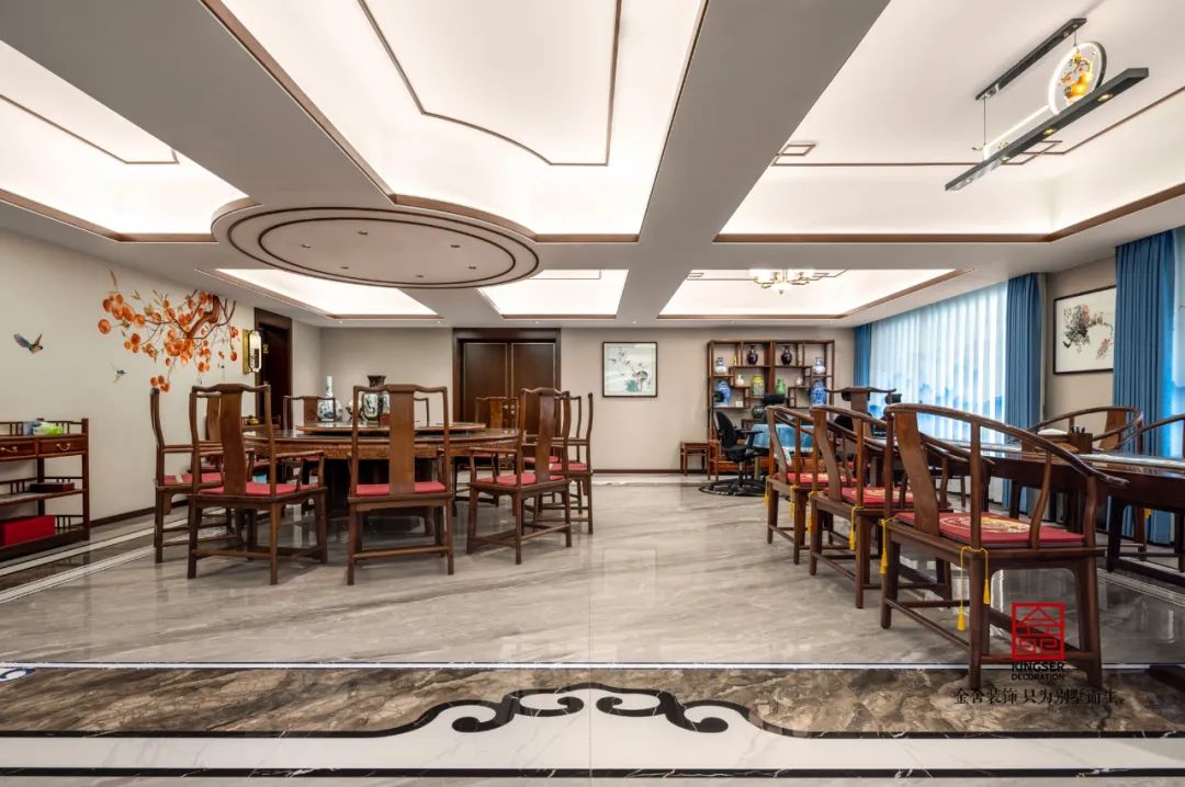 总经理办公室将人工造景与红木家具完美结合,休憩,观景,工作几方面都不耽误,空间雅致不凡,顶面不同造型的吊顶也是将使用功能不同的空间完美分开,塑造出一种非同寻常的贵气效果。