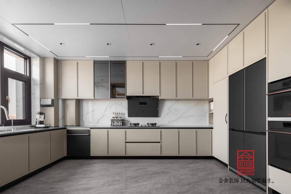 圆形吊顶就好像是映刻在天空的餐桌,团圆的意味在此时浓烈了起来,黑色的石材,黑色的玻璃门,将沉稳质感拉满。家人围坐,餐盘碰撞声、谈笑声绕着这方天地打转,团圆不再是抽象的词,成了触手可及的暖。