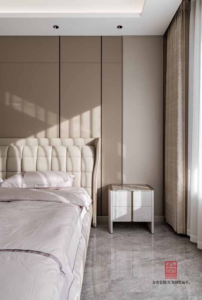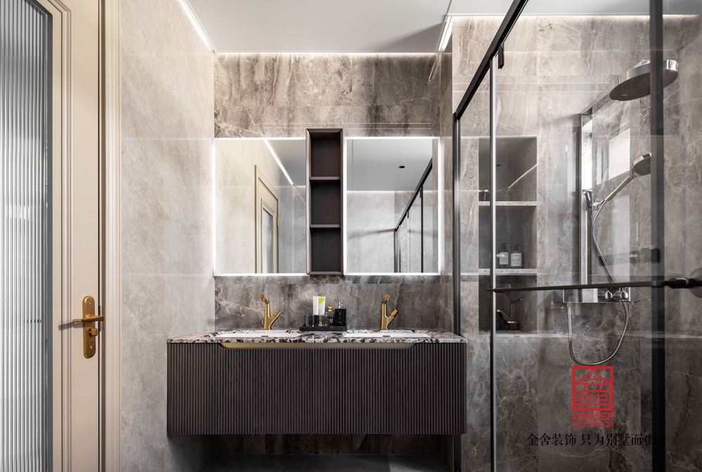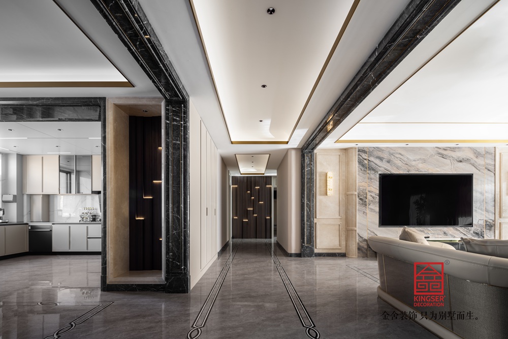 如滔滔江水倾泻而下的石材肌理,赭石与黑色的颜色对撞,石材的坚硬与皮制的温润的融合,金属的边缘与整体温暖的配色,这是客户对生活的向往,也是对美好未来的构建。