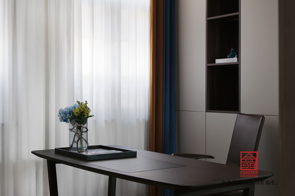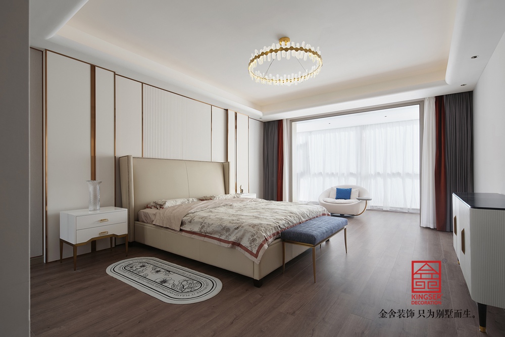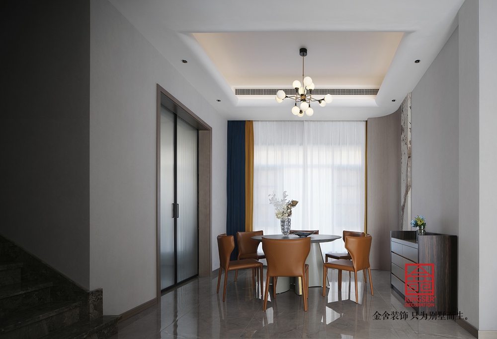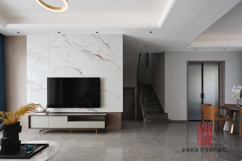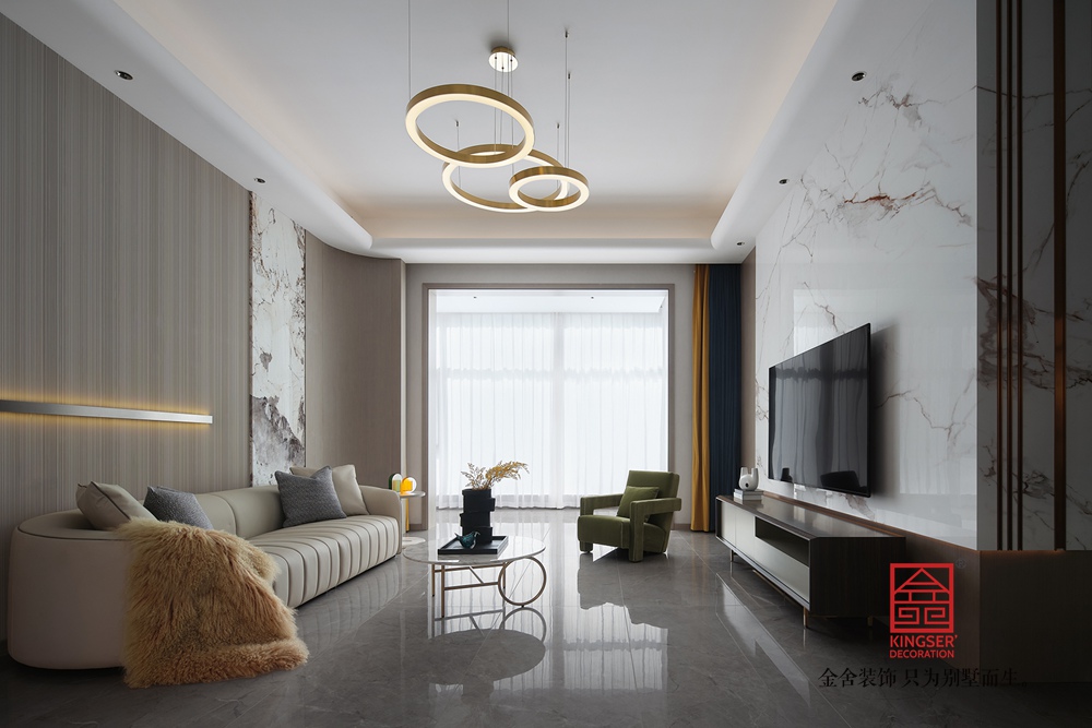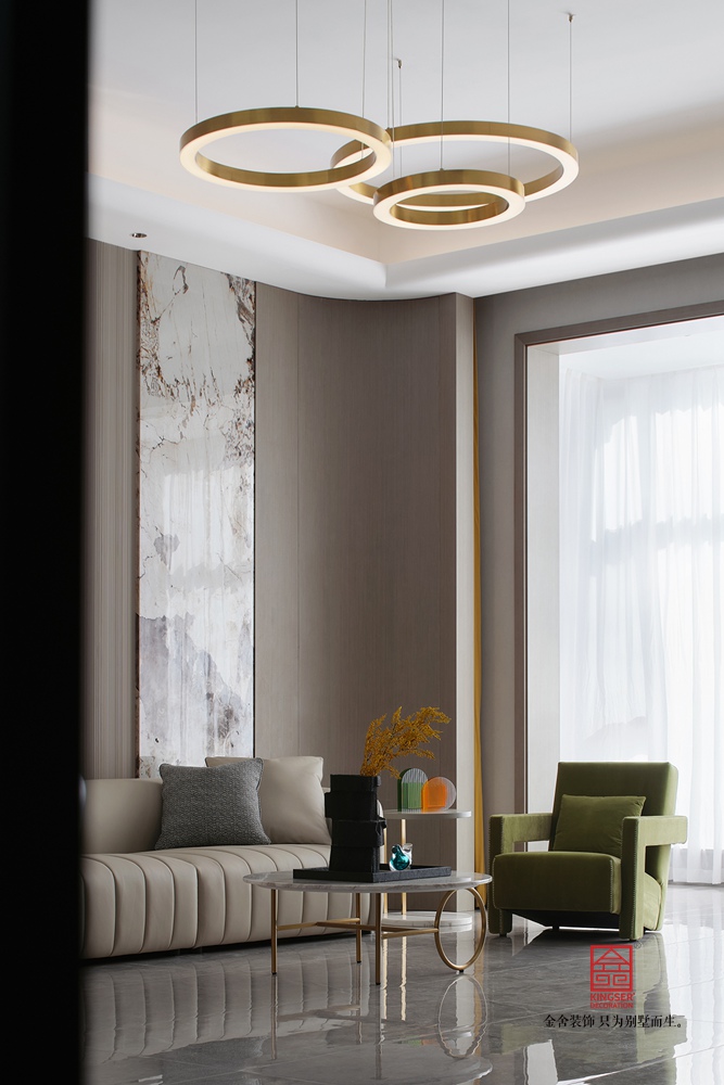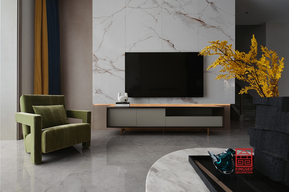 在设计上通过简约的直线型、几何型造型减少了视觉负担,也更符合现代审美,而在颜色的搭配上整体以米白、浅灰等低饱和度色系为主奠定柔和高级的基调,同时在局部使用一些亮色来提亮,在避免单调的同时强化轻奢质感,,诠释了意式轻奢“简约而不简单,奢华却不张扬”的风格内核,为居者打造了一个“舒适且有格调”的理想家。