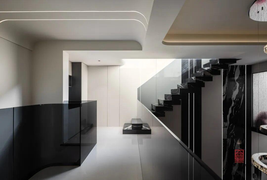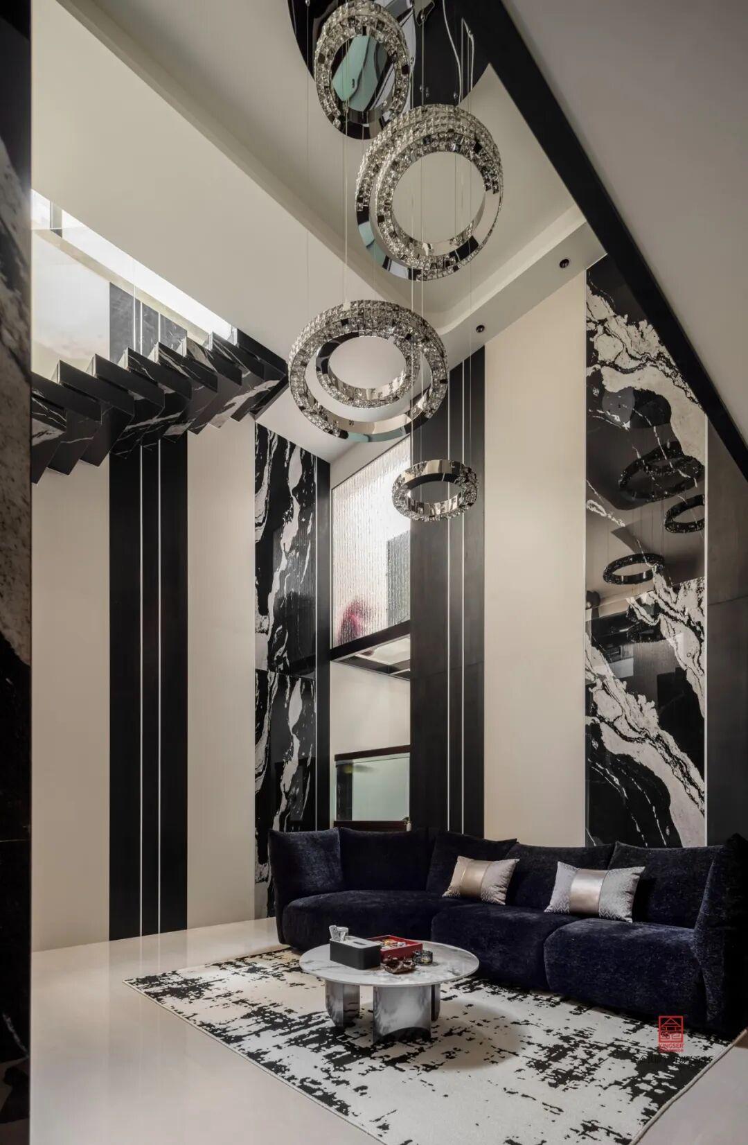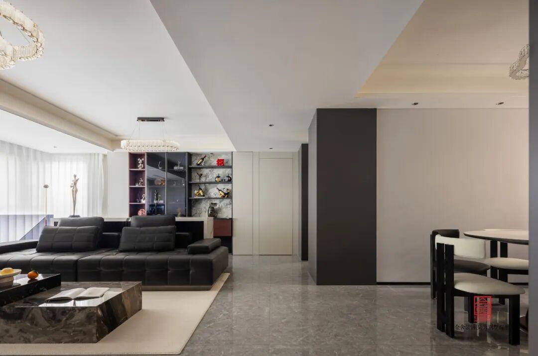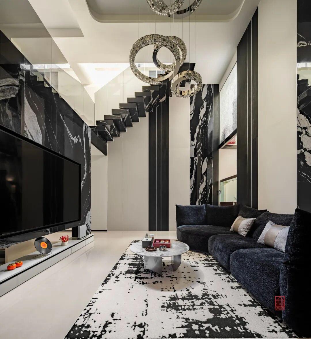 负二客厅中,材质的运用更加的出彩,黑白纹理的大理石嵌入条状的灯槽,在夜晚用灯带就能感受到非同凡响的光效,简单的设计就让整个空间明暗层次分明,兼具氛围感与高级感,让简约空间更具张力与质感。