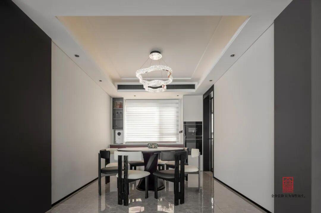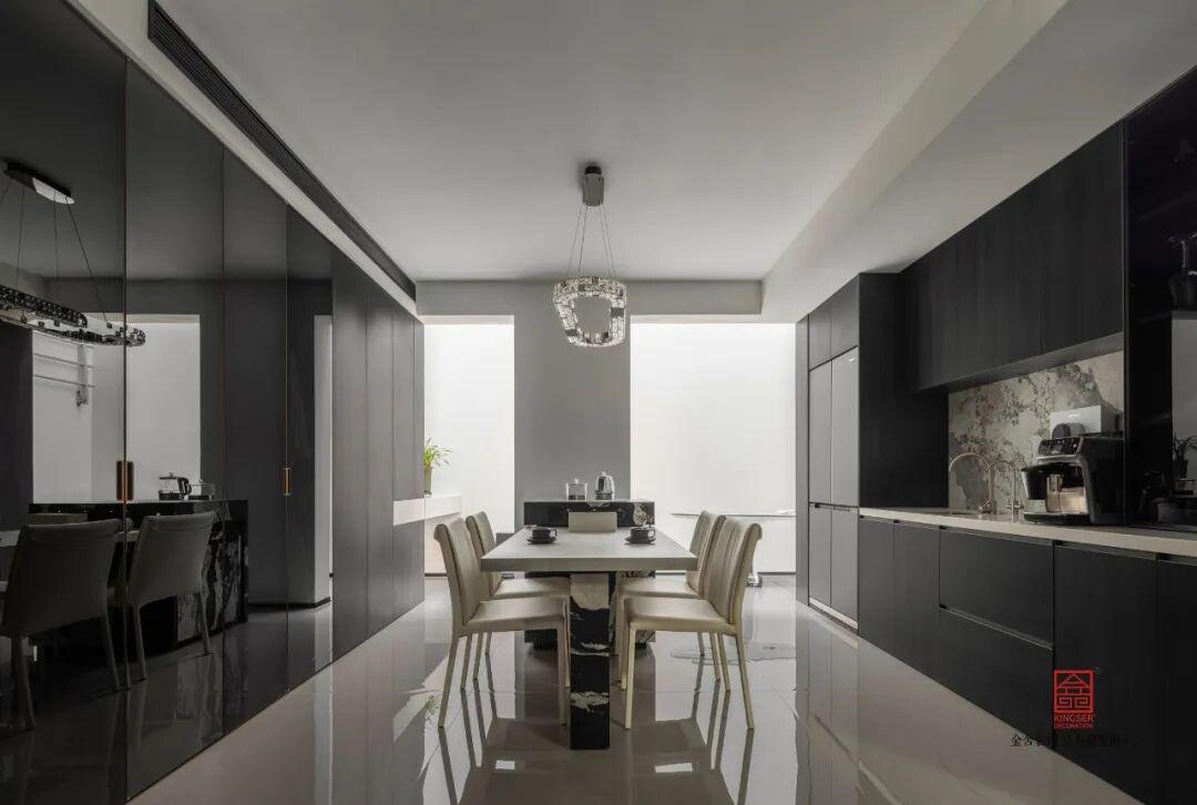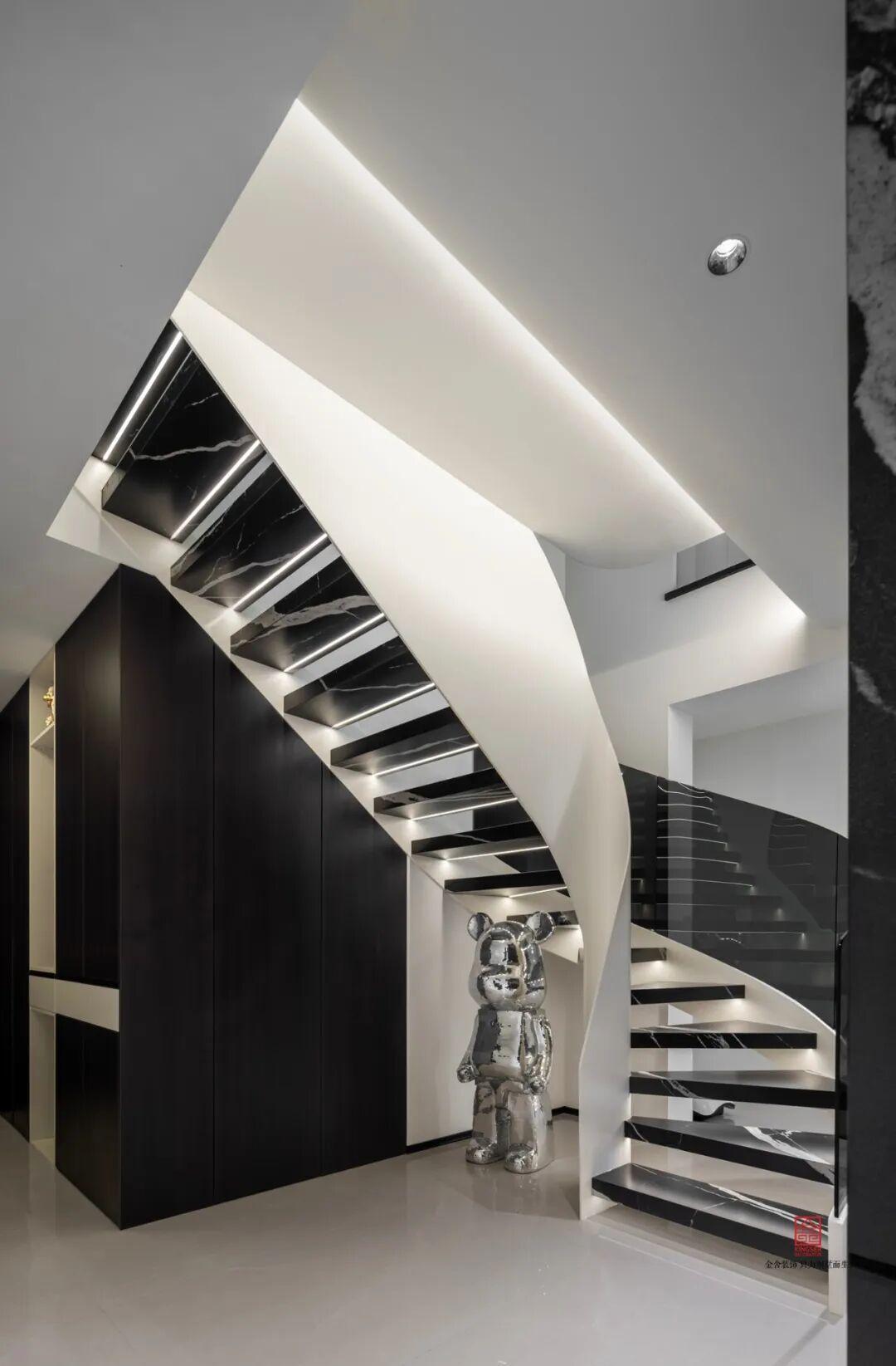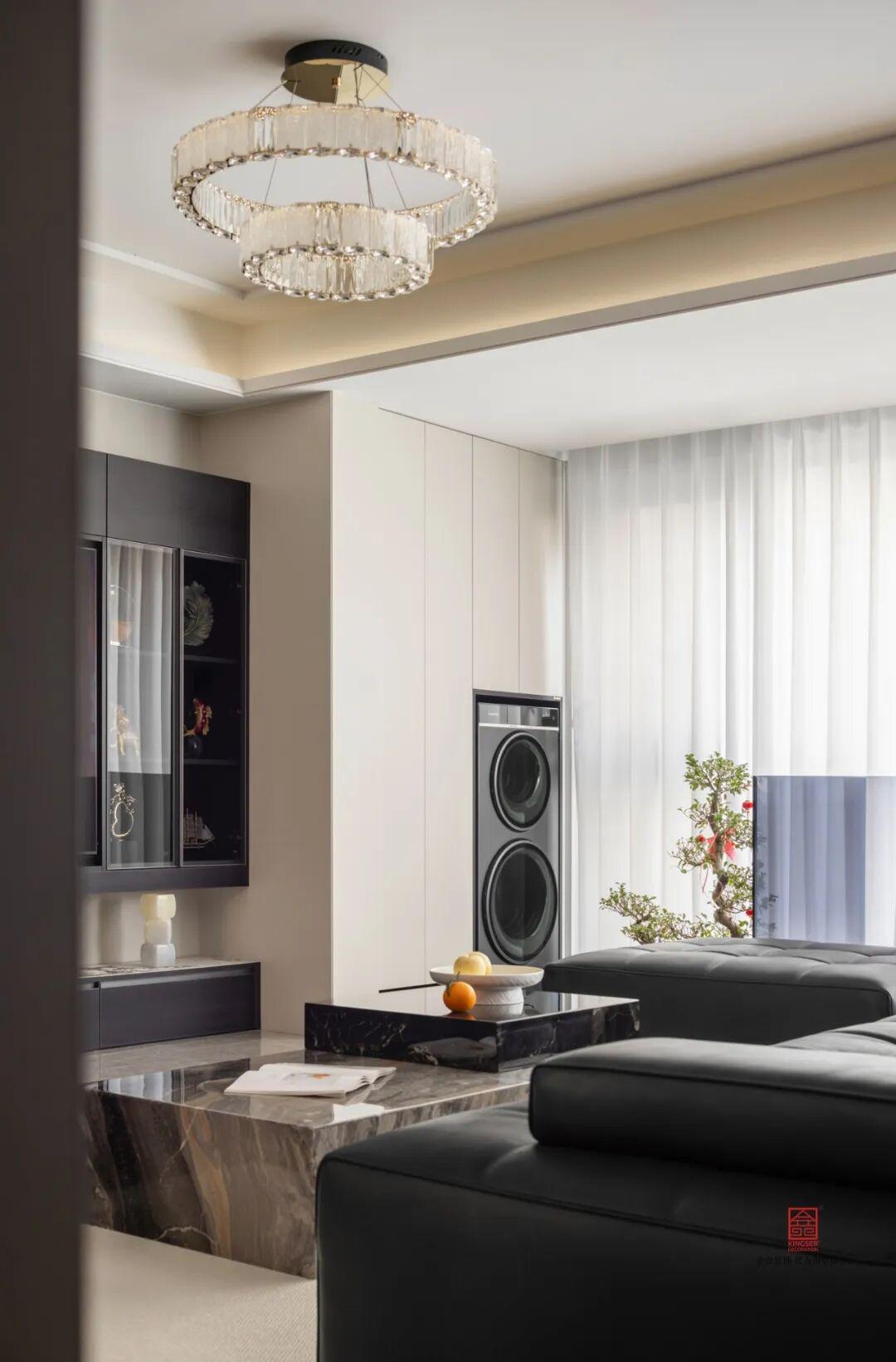 负二客厅中,材质的运用更加的出彩,黑白纹理的大理石嵌入条状的灯槽,在夜晚用灯带就能感受到非同凡响的光效,简单的设计就让整个空间明暗层次分明,兼具氛围感与高级感,让简约空间更具张力与质感。