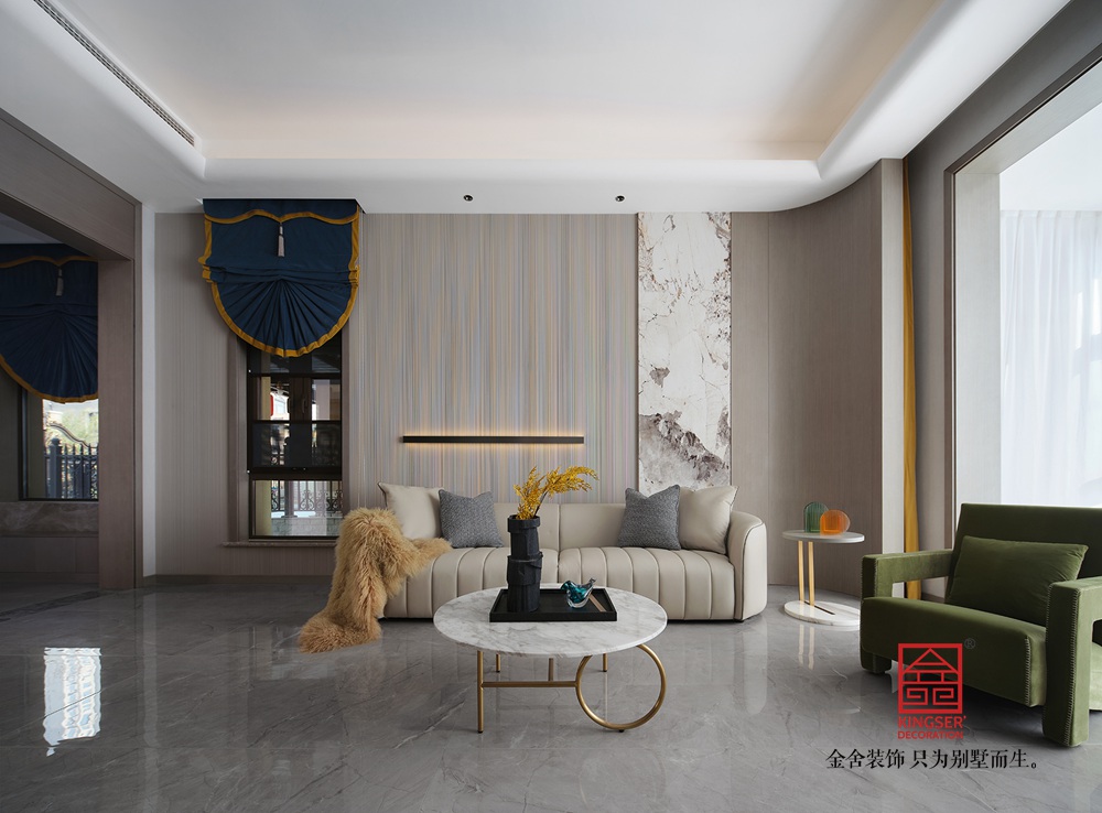 创意感十足的复古座椅点缀出家具的奢华,经典与时尚兼具,纱幔一般的窗帘散发着温馨的味道,窗帘以法兰绒和纱织材质构成,着重色彩与肌理的把握符合整个空间的优雅气质。