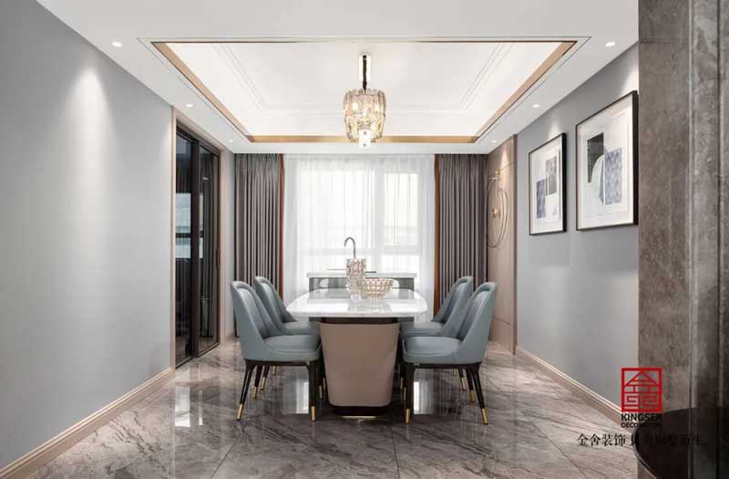 设计了餐桌+岛台的形式,延展了操作台面,形成了一个完美的就餐区。灰色的餐桌椅跟墙面的颜色和谐而糅合,墙面上的画、餐桌椅、墙面三者颜色合为一体;吊顶的金色、灯的金黄加上桌面的那些金属器皿,三者合为一体。这就是一种在相容中突出个体的美观,这是设计师对于颜色的完美感悟。