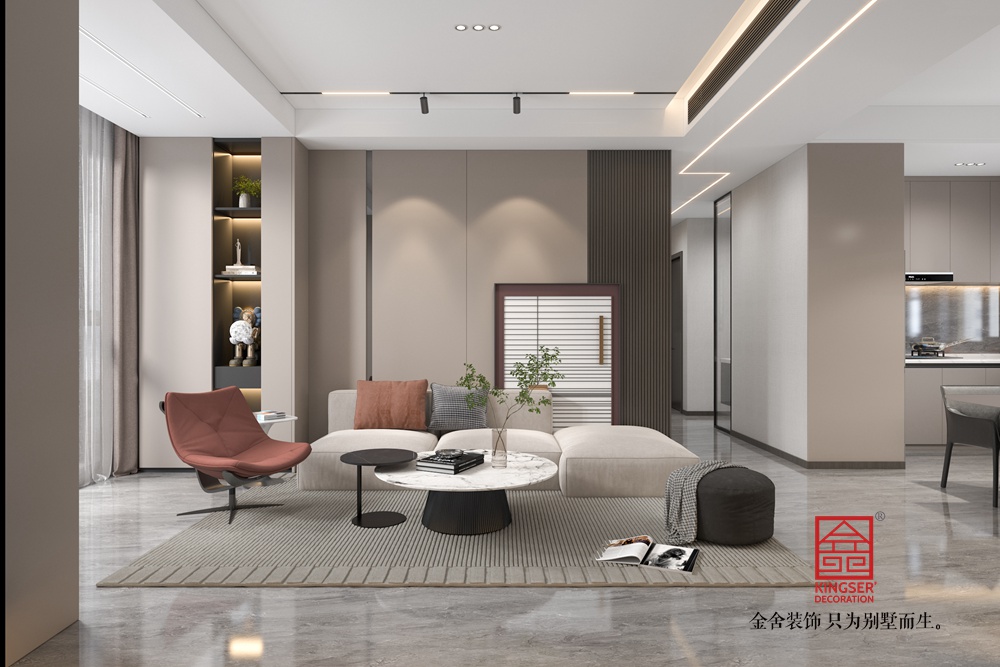 本设计案例展现了一个集现代美学与实用性于一体的客厅空间,完美诠释了金舍装饰对于高品质家居生活的追求与承诺。整体设计围绕“简约而不简单”的理念,旨在打造一个既舒适又富有格调的居家环境。