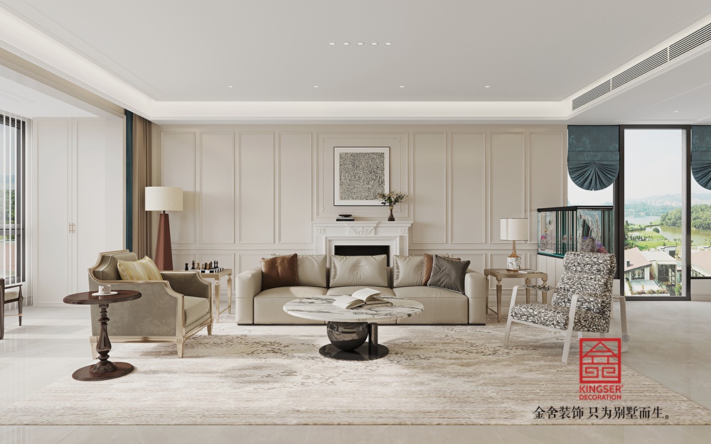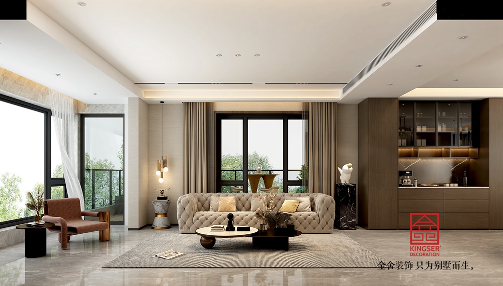 此案例为石家庄别墅装修-瑞凝府185平米现代简约装修效果图本客厅设计以现代简约风格为基调,旨在打造一个温馨舒适、功能齐全的居家环境。通过巧妙的色彩搭配和家具布局,实现了空间的最大化利用,营造出一种既宽敞又温馨的居住氛围。