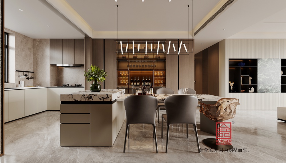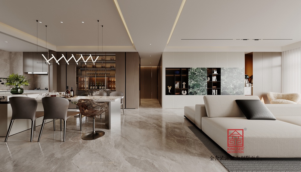 此案例为金舍装饰-龙湖天奕230平米意式轻奢风格装修效果图。本设计方案客厅设计以现代简约为核心,追求空间的开阔与通透。浅米色为主色调,搭配简洁的硬装线条,营造温馨、大气氛围。