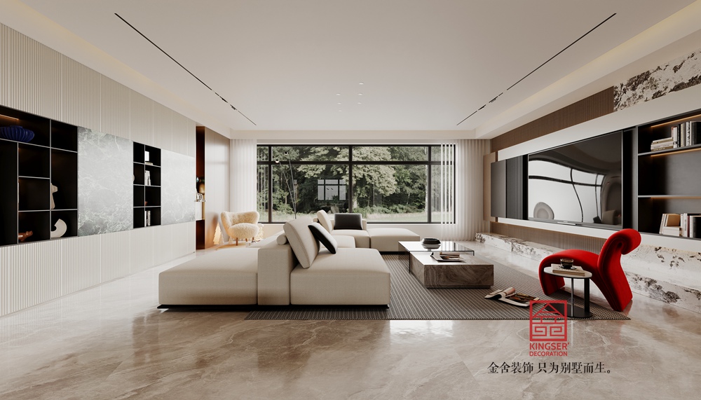 家具选型简约舒适,红椅作为视觉焦点,活跃空间。整体设计平衡功能与美学,诠释现代别墅生活的从容与雅致,契合 “只为别墅而生” 的品质追求