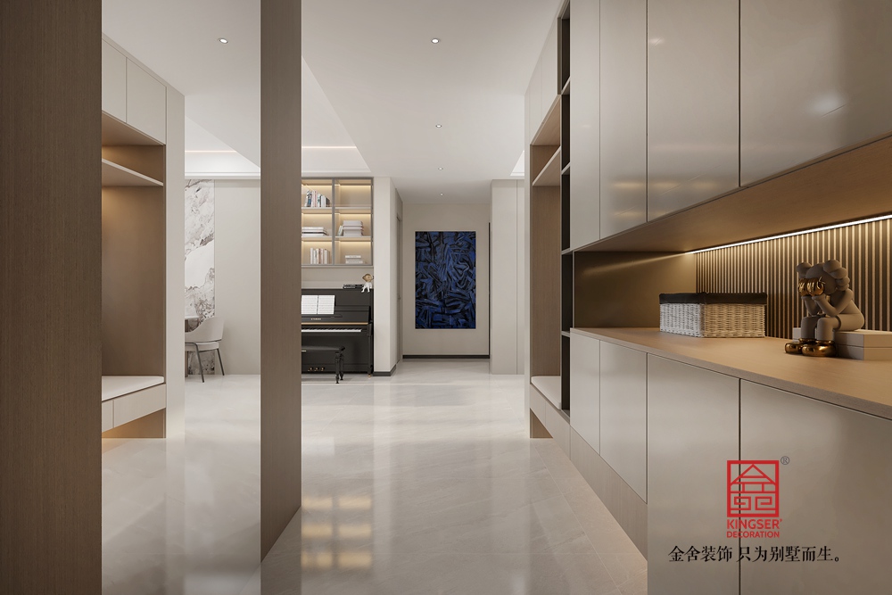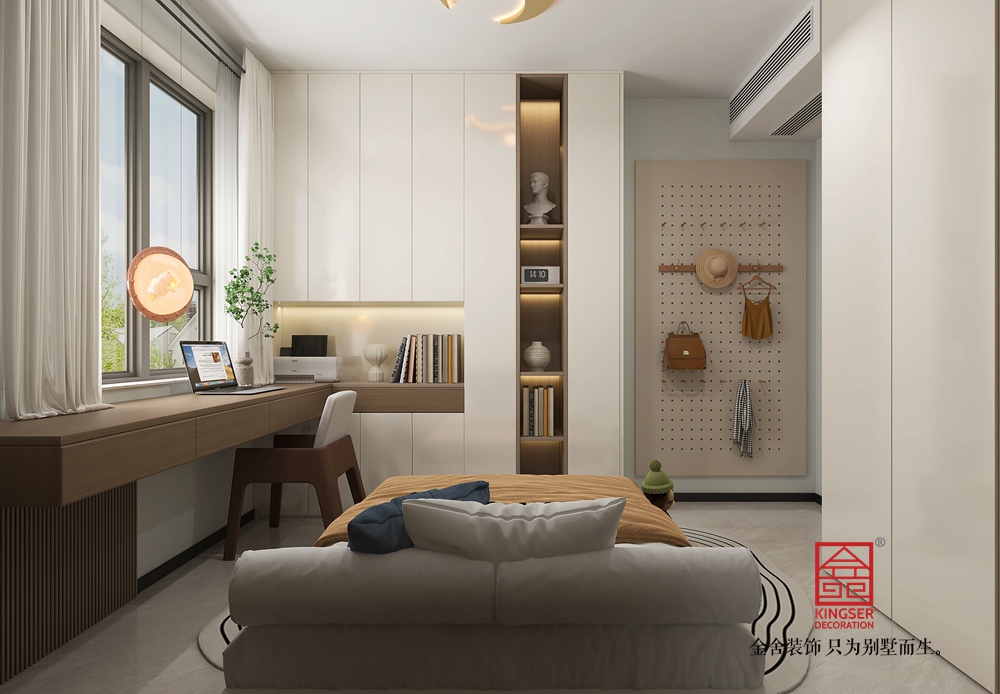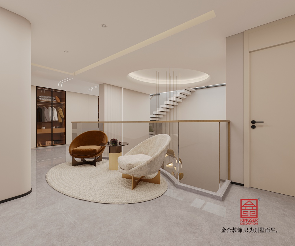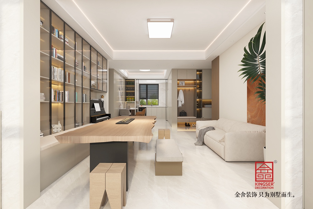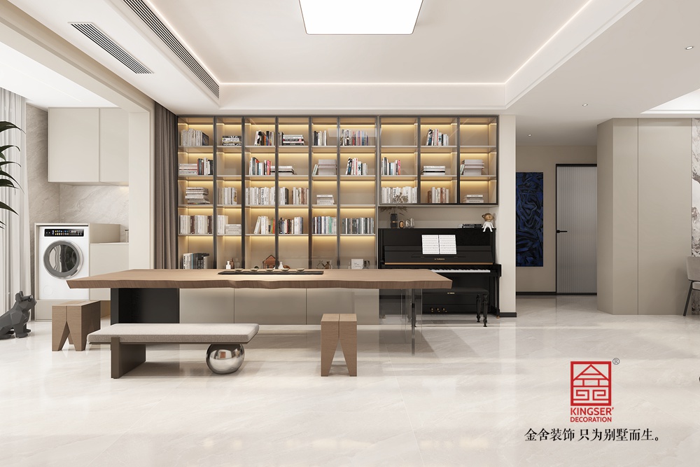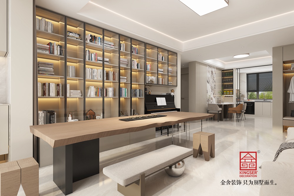 在功能布局上,打造了集阅读、艺术创作与休闲于一体的复合区域。整面玻璃书柜,通透感十足,内置暖光,既方便书籍取阅,又为空间增添了温暖氛围,成为知识与美学的载体。