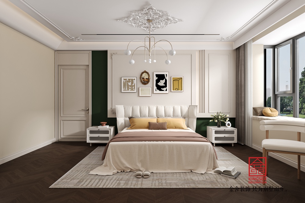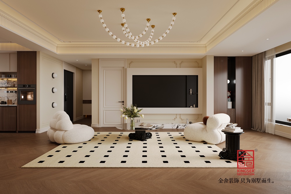 家具选择颇具巧思,造型圆润的白色单人椅,如云朵般柔和,中和了复古元素的厚重;带有雕花的黑色茶几,精致细节尽显中古韵味。黑白几何图案的地毯,为空间注入复古时尚感,同时划分出核心区域。