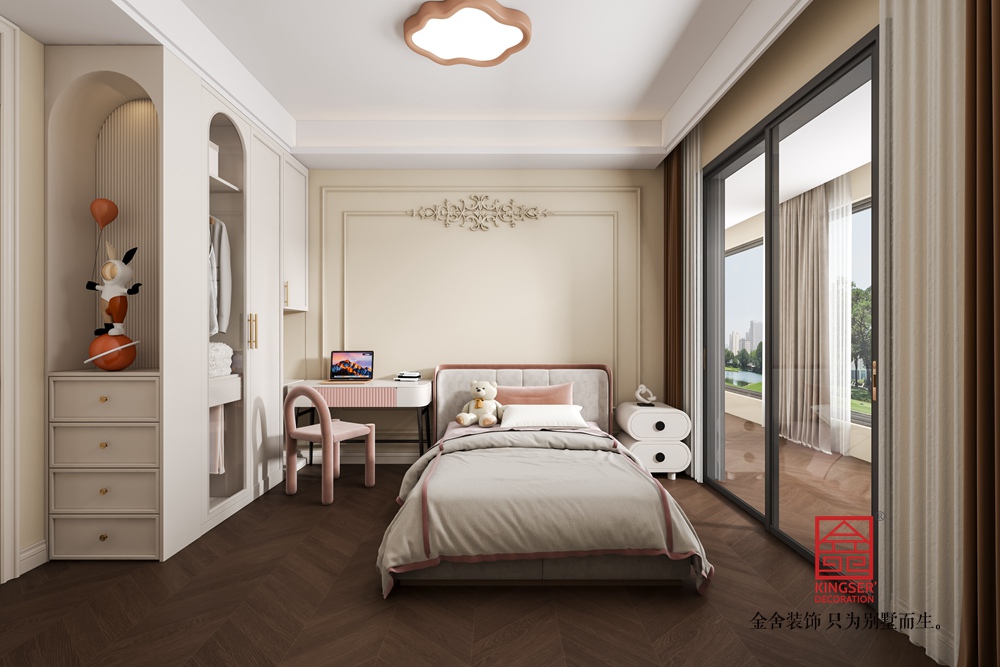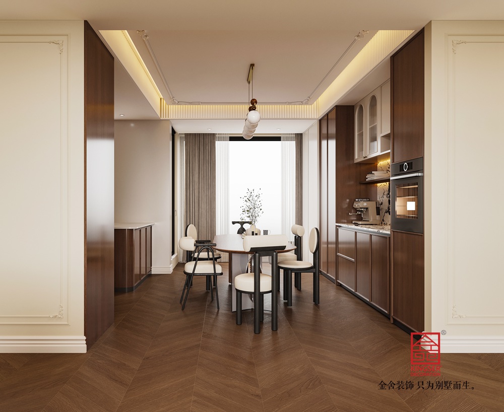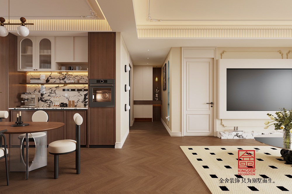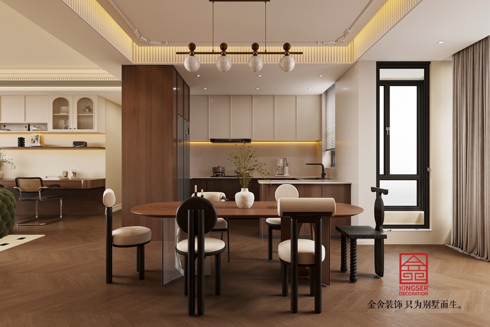 顶部的串珠造型吊灯,线条灵动,散发着复古浪漫气息。背景墙的收纳与展示柜体,融合了中古风格的简约与实用,陈列的摆件、书籍,为空间增添生活气息与文化底蕴,整体打造出一个兼具复古风情与舒适体验的中古风客厅。