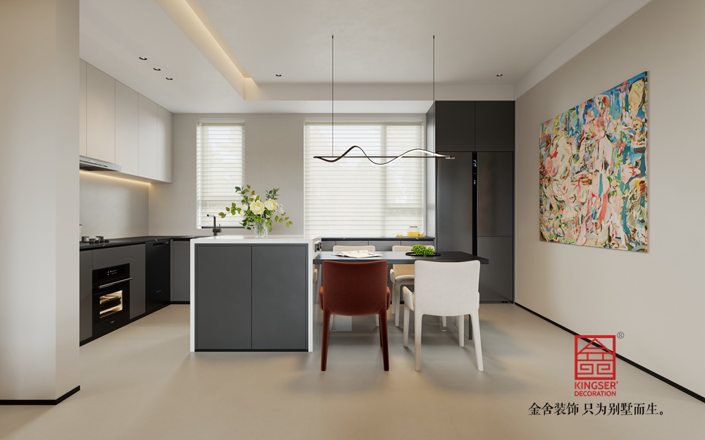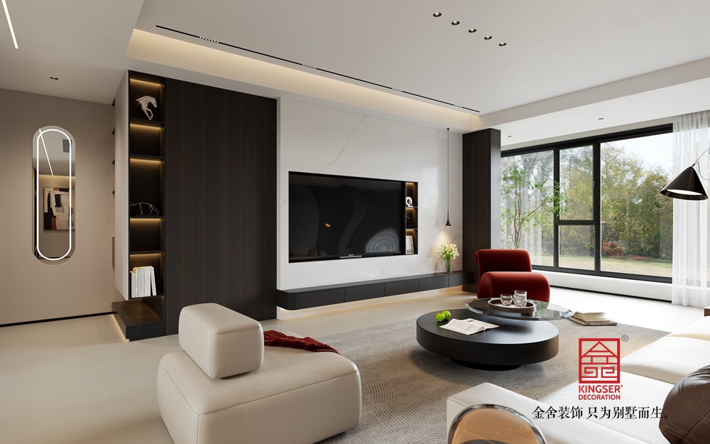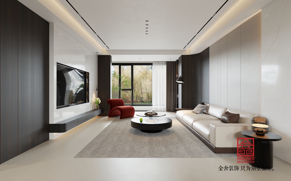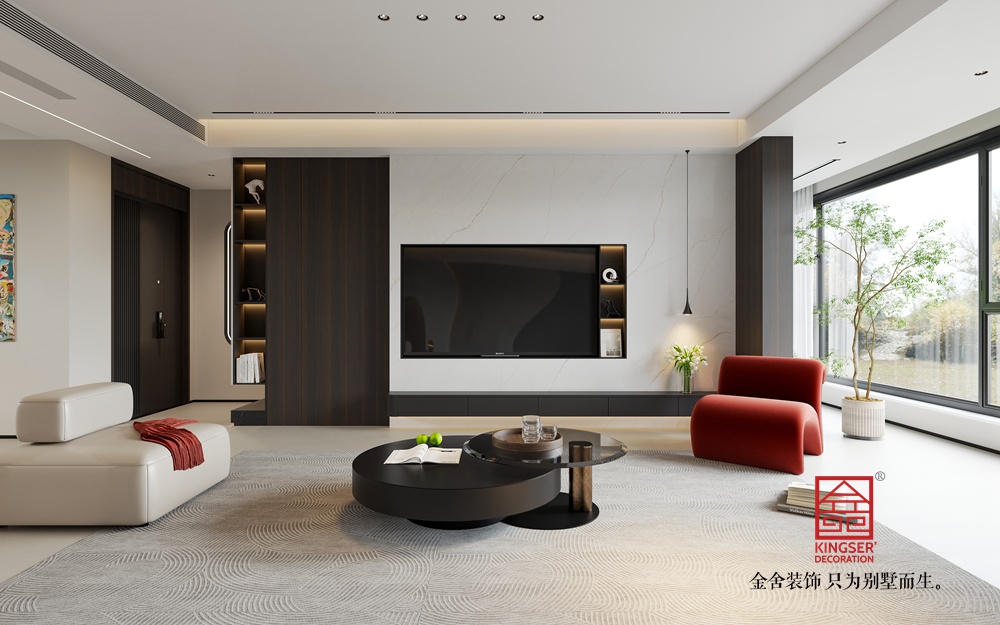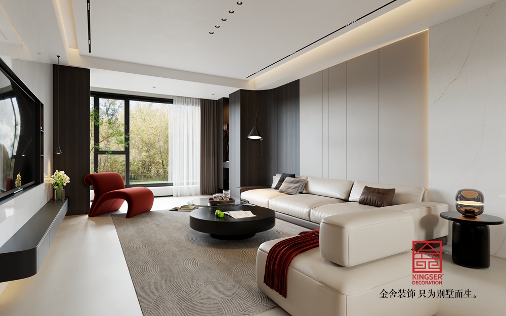 沙发选取浅米色,搭配深浅不一的抱枕,营造出舒适且富有层次的休憩区域。黑色弧形组合茶几,线条流畅,与整体空间的简洁感相契合,同时为空间增添了一份灵动。红色异形休闲椅,作为视觉焦点,以鲜明的色彩和独特的造型,打破了空间的单调,注入活力与艺术气息。