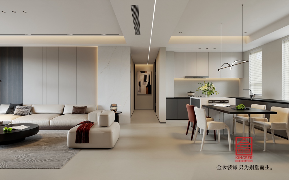 顶部采用无主灯设计,结合线性灯光与点光源,柔和地照亮空间,营造出静谧温馨的氛围。地面的纹理地毯,不仅划分了功能区域,还为空间增添了细腻的触感与视觉层次。整体设计通过对色彩、材质与光影的精妙把控,打造出一个简约而不简单、舒适且富有格调的现代客厅空间,尽显对品质生活的追求。