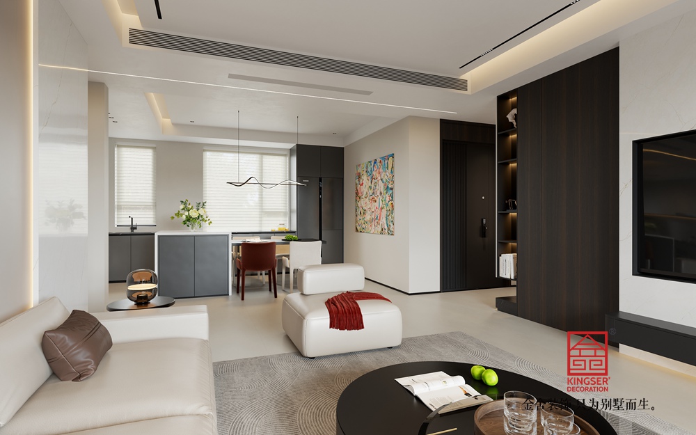 本客厅设计秉持现代简约风格,追求空间的通透与质感。以浅色调为主基调,搭配深色木质墙板,形成冷暖色彩的和谐对比,既显轻盈又具沉稳底蕴。