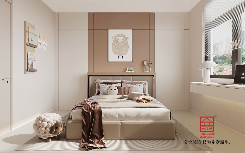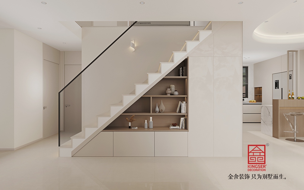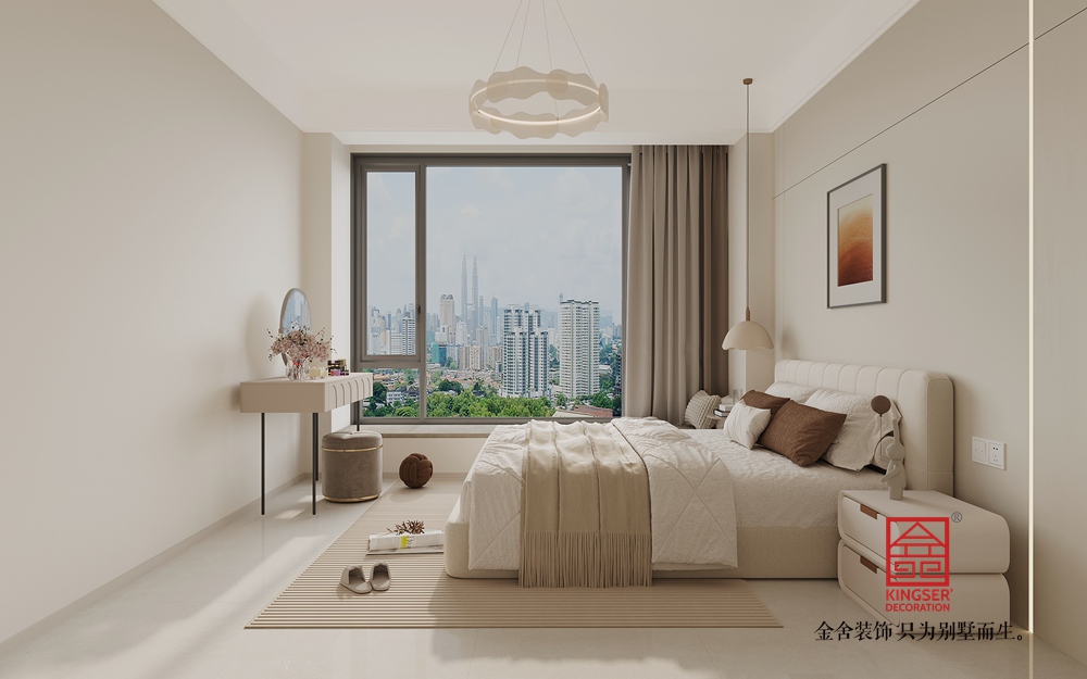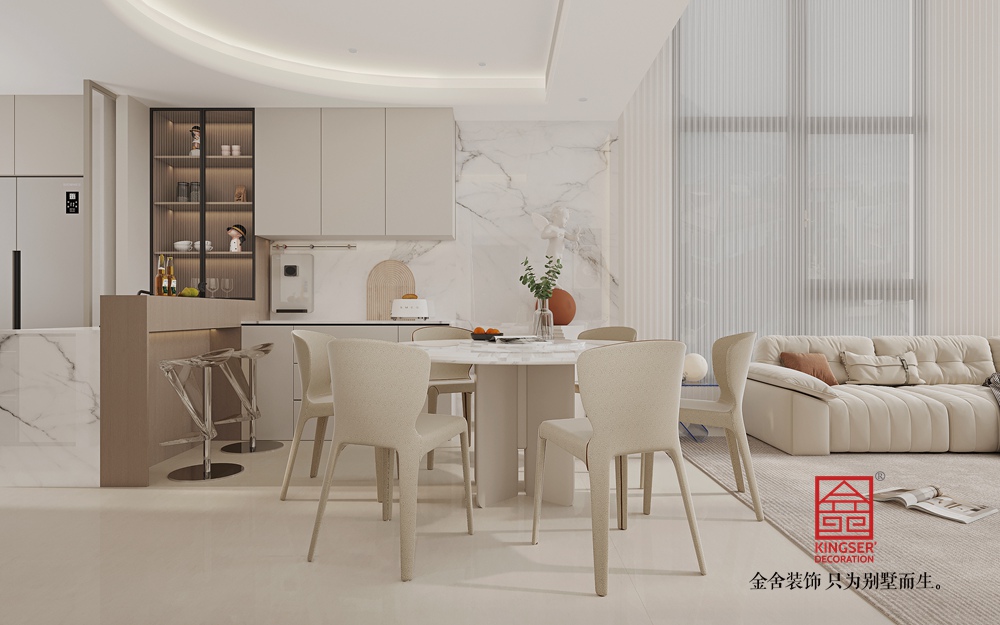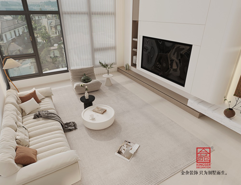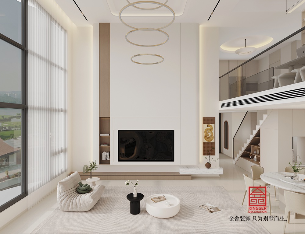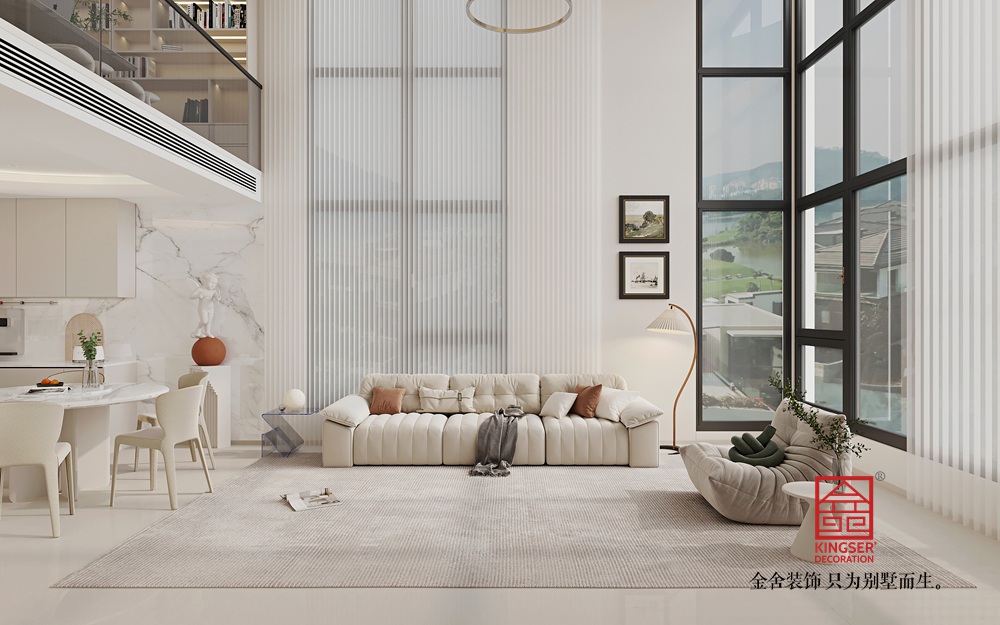 空间上,挑高设计搭配大面积玻璃窗,充分引入自然光线,让室内外景观相互交融,极大地拓展了视觉空间感。家具选择注重线条的简洁流畅与材质的柔和质感,米白色沙发、弧形单人椅等,造型简约又不失优雅,为空间增添了温馨感。