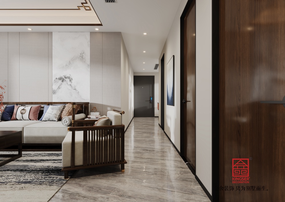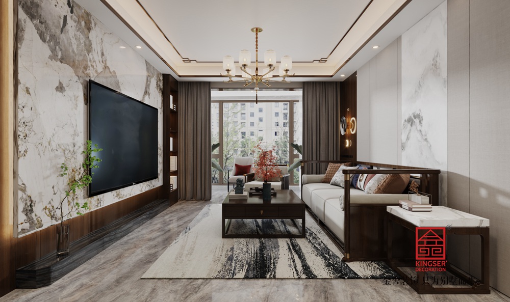 本客厅采用新中式风格设计,将传统中式元素与现代生活需求巧妙融合。以沉稳的木色为基底,搭配大理石纹理墙面,既显中式的典雅厚重,又添现代的精致感。