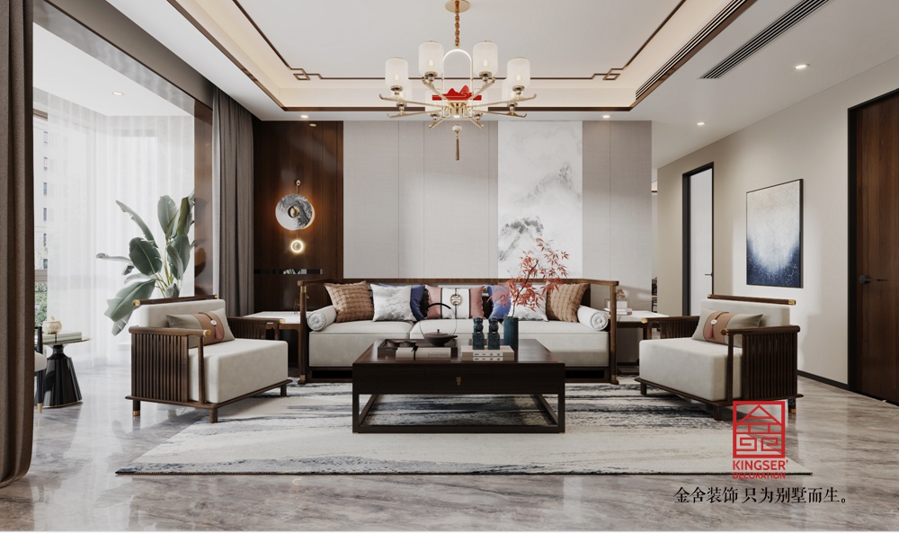 家具造型简约大气,线条流畅,实木框架与舒适软垫结合,兼顾中式韵味与使用舒适度。中式吊灯、精致摆件以及绿植点缀,为空间注入文化气息与自然生机。大窗户引入充足自然光,让室内外景致相互呼应,营造出雅致、舒适且富有格调的居家氛围,尽显新中式风格的独特魅力。