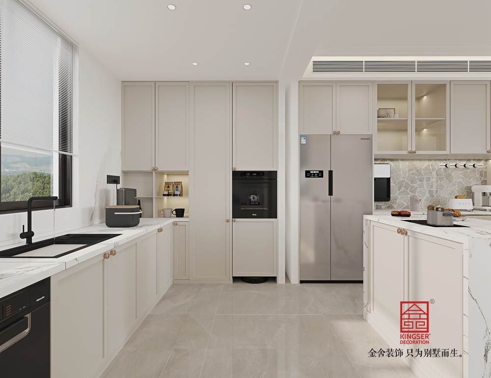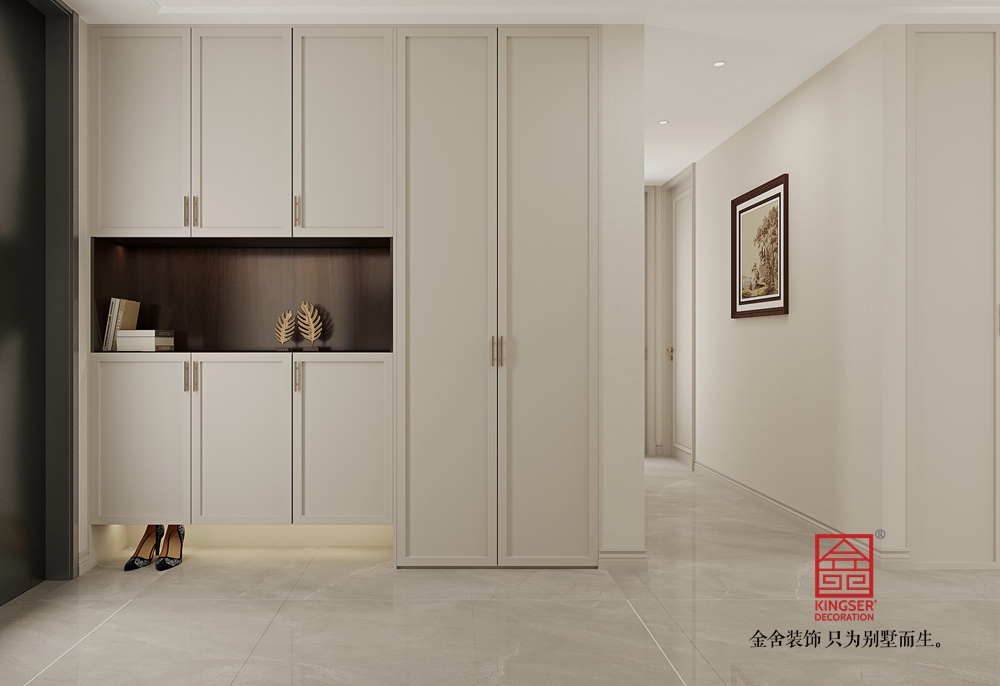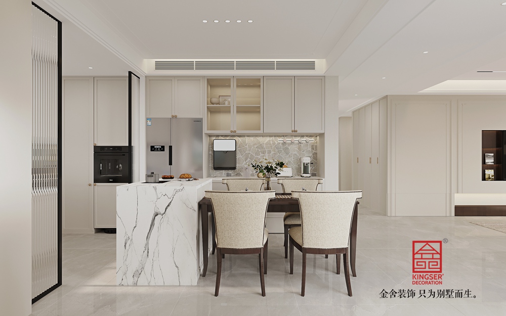 空间以柔和的暖色调为主,墙面的护墙板设计,带有美式风格典型的线条感与立体感,细腻的雕花元素,为空间注入复古韵味,同时又通过简洁的造型,契合现代审美。