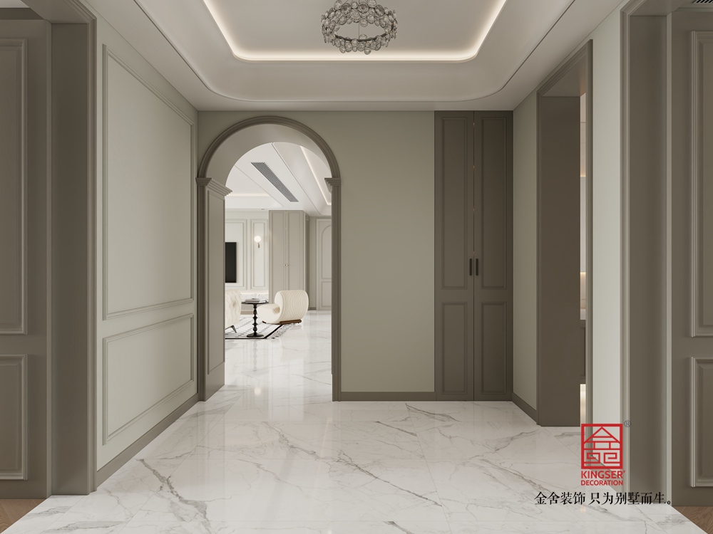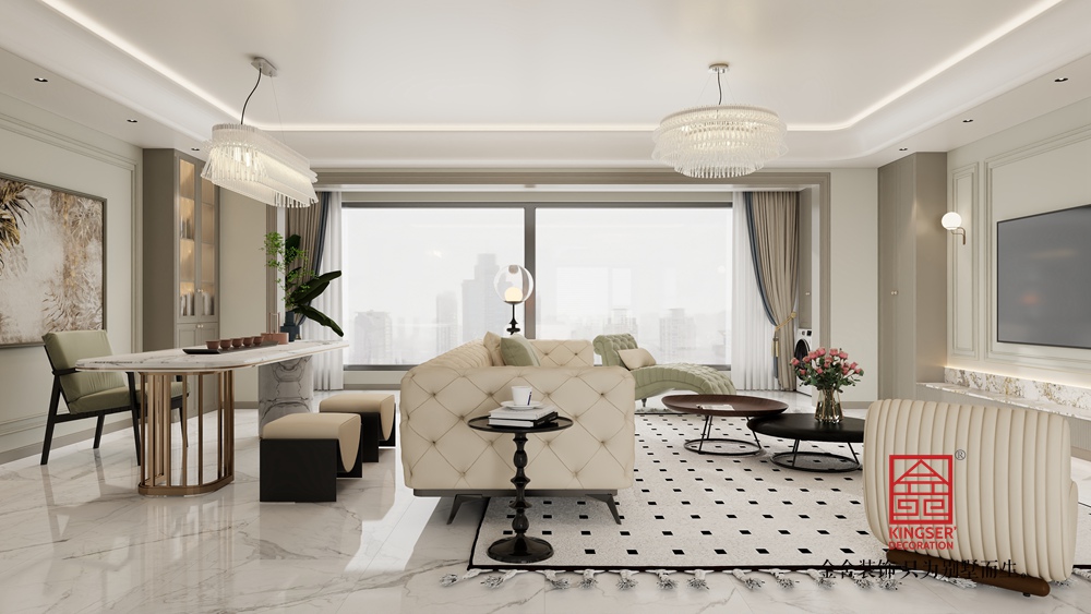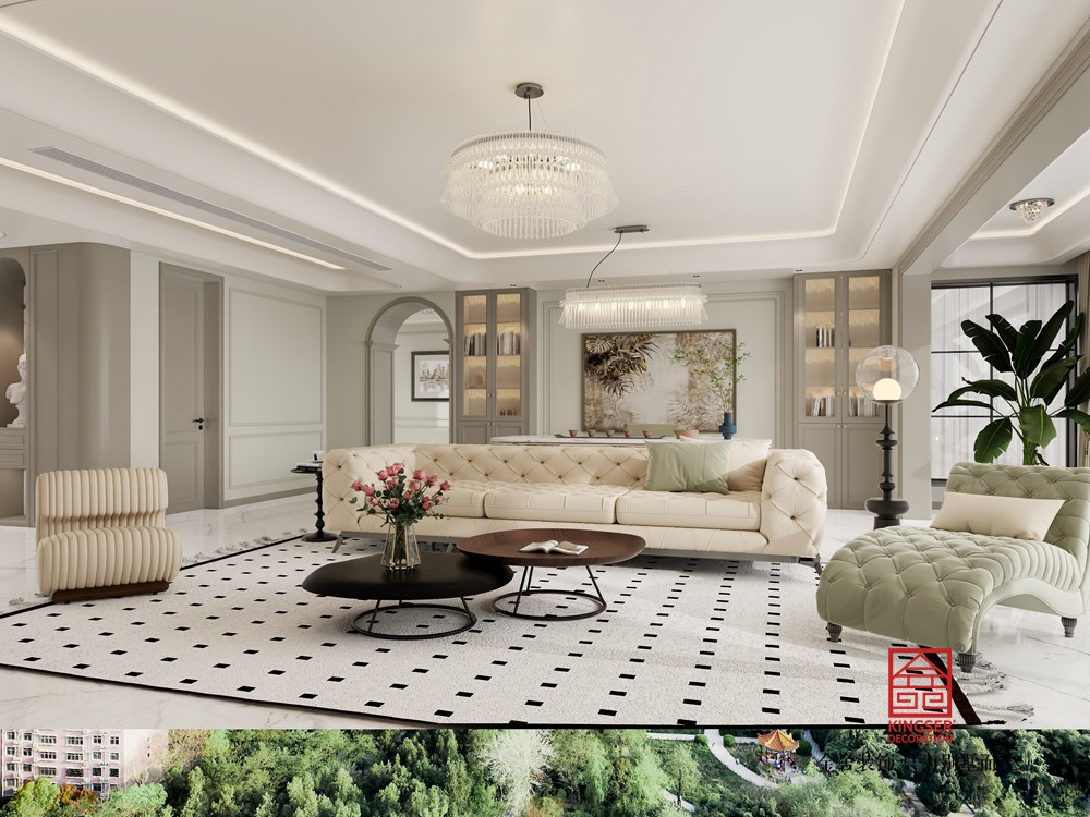 本客厅设计融合了现代轻奢与优雅格调。以柔和的浅色调为主基底,营造出温润雅致的空间氛围。精致的水晶吊灯与线条流畅的家具相得益彰,彰显出轻奢质感。