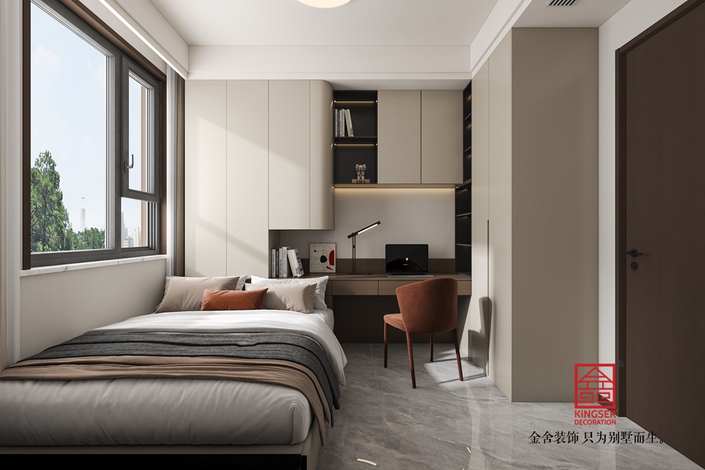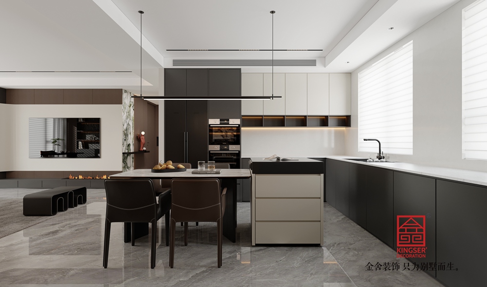 采用开放式设计,将客厅与餐厨区自然衔接,增强空间通透感与互动性。客厅区域功能分区明确,休闲会客、阅读办公等功能在同一空间内有序呈现,满足别墅生活的多元需求。