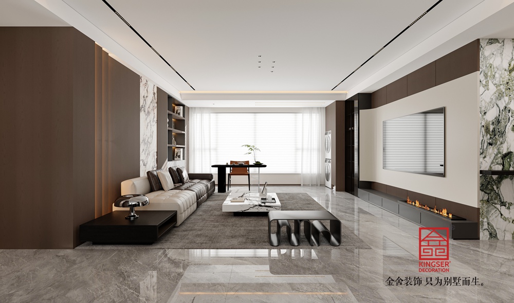大理石纹理的茶几、造型独特的黑色矮凳、富有艺术感的陈设摆件,以及绿植的点缀,从功能与美学层面丰富空间,每一处细节都彰显出对品质生活的追求,诠释了现代别墅空间 “只为精致生活而生” 的设计理念。