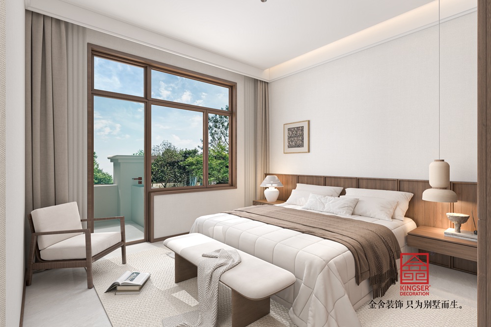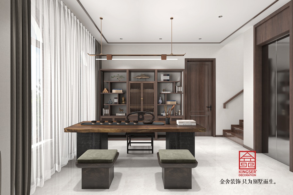 材质运用上,以温润的木质元素为主,搭配光洁的大理石地面,在展现自然质感的同时,提升了空间的精致度。复古的木质楼梯扶手与定制的木质装饰墙,呼应了新中式风格的传统韵味。