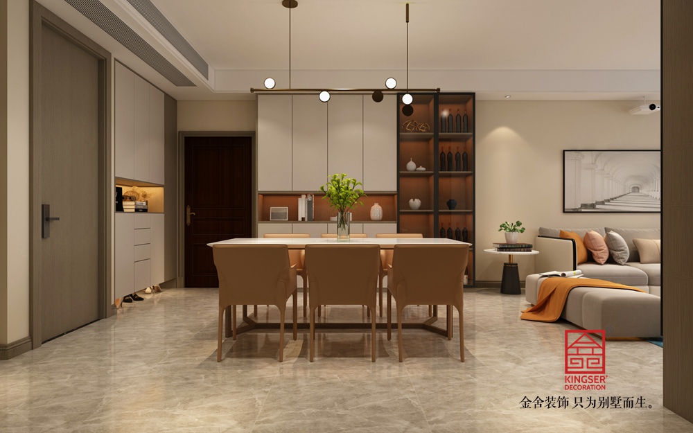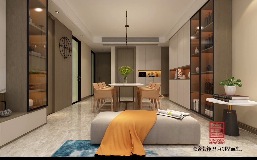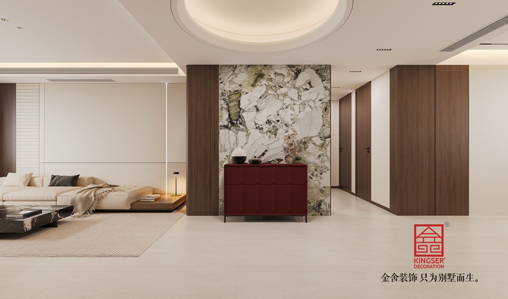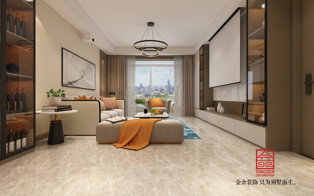 空间布局上,以浅灰色多人沙发为核心,搭配同色系单人休闲椅,通过橙色、粉色抱枕的点缀,打破单调,注入活力。异形大理石纹理茶几造型别致,既具实用功能,又成为视觉焦点。左侧的多功能矮凳与橙色搭毯,增加了空间的层次感与舒适感。