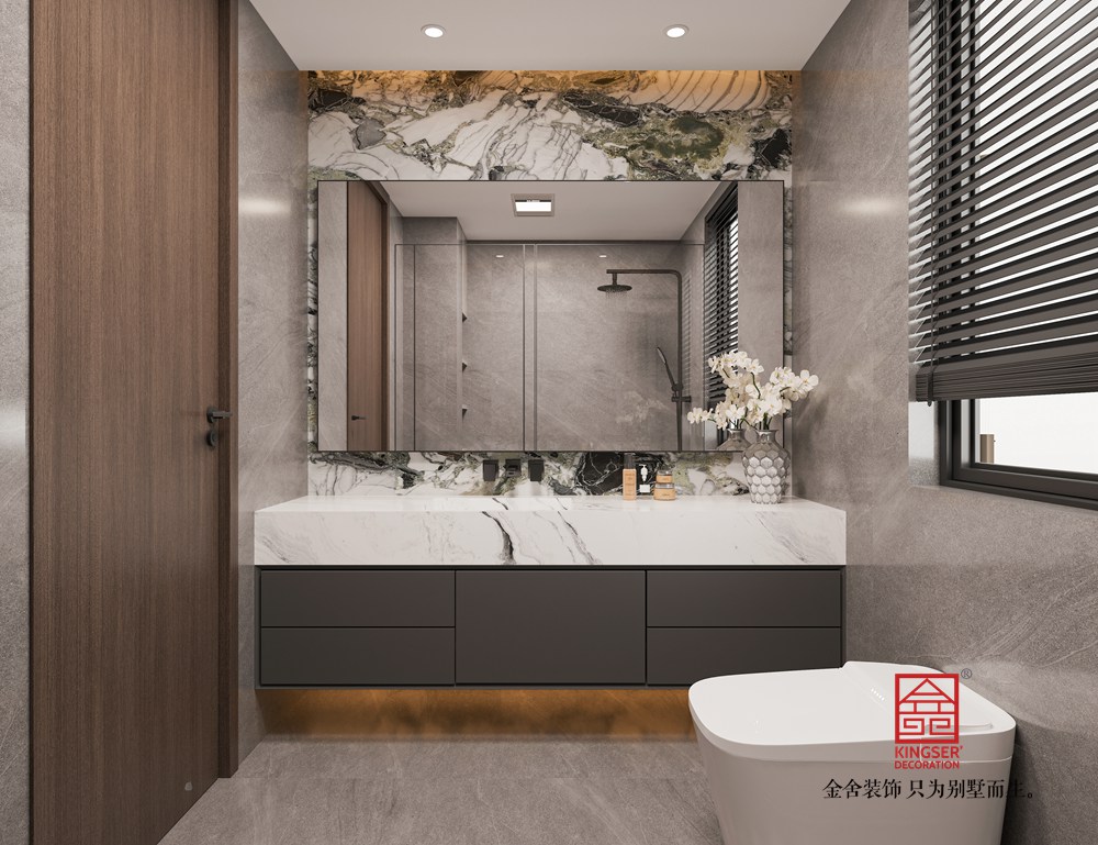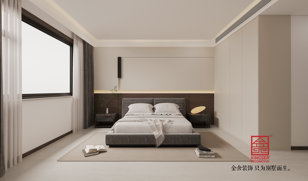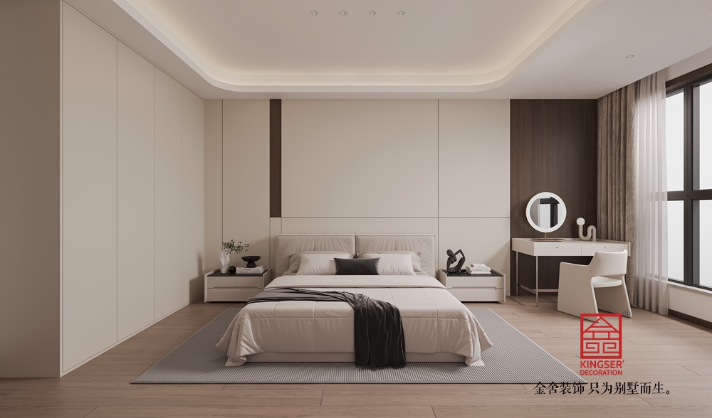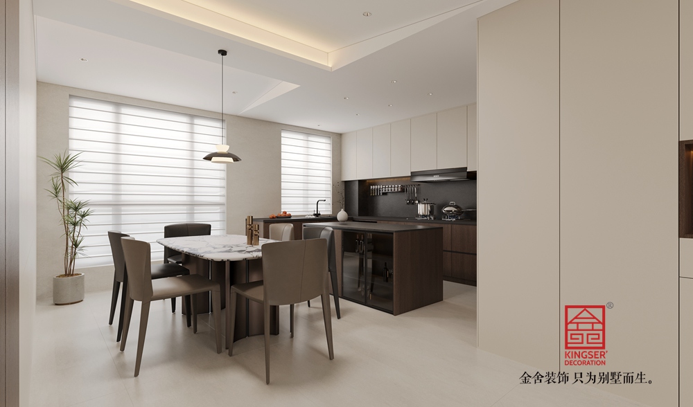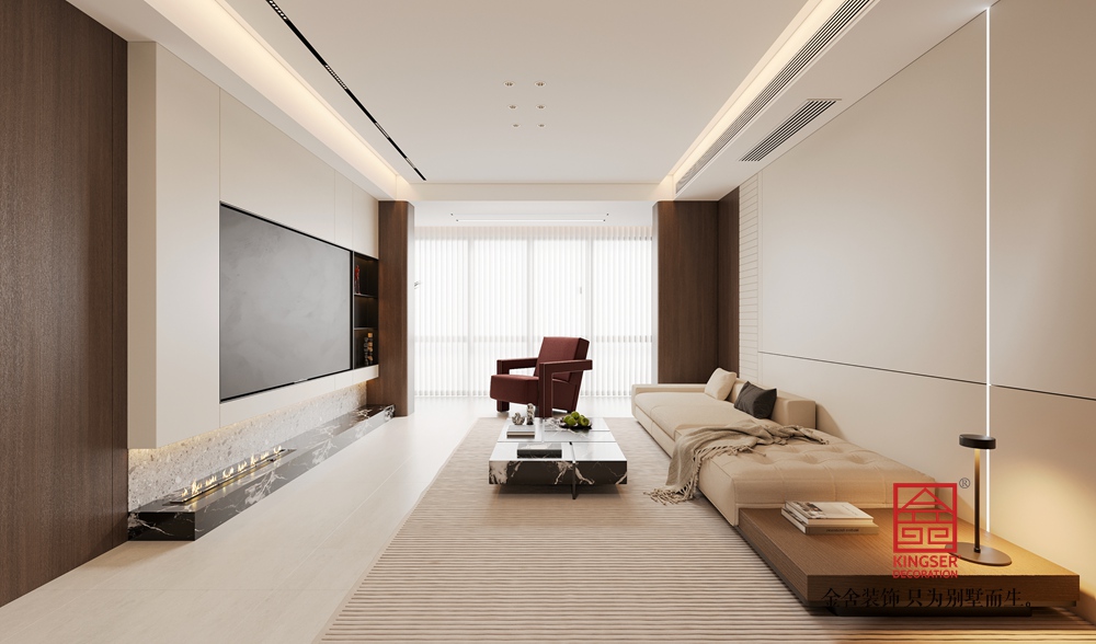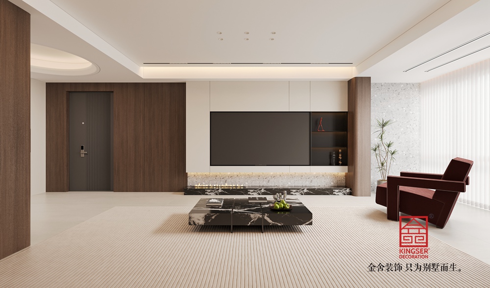 以米白、深棕为主色调,搭配大理石、实木与哑光金属材质,形成温暖且高级的视觉层次。电视背景墙的石材壁炉与木质柜体相呼应,既显自然肌理,又添奢华质感;沙发区的布艺软包与大理石茶几,在柔与刚的对比中平衡了空间气质。