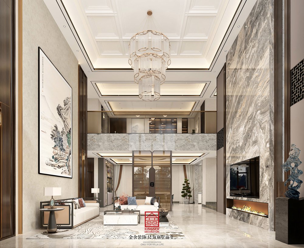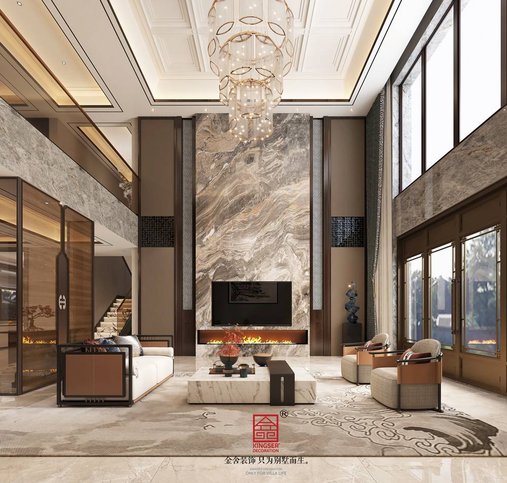 本设计以新中式风格为基调,聚焦别墅客厅的空间质感与文化内涵,打造兼具奢华格调与东方意蕴的生活场域。整体设计在满足功能需求的前提下,通过对风格、材质、色彩、软装与文化的综合把控,打造出一个既符合现代别墅居住品质,又充满中式文化底蕴的客厅空间。