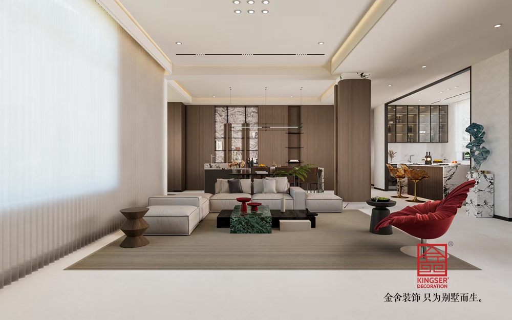 本案为金舍装饰-荣盛华府260㎡底跃装修极简风格效果图。极简主义在欧洲的兴起正是符合了人们对于奢华之外的探求,就像在之前大火的断舍离是一样的。这种简约中透着单纯的意味,既是一种生活方式也是一种人生的态度,没有复杂,没有冗余,只有对于生命的沉醉和对于美好未来的一往无前。